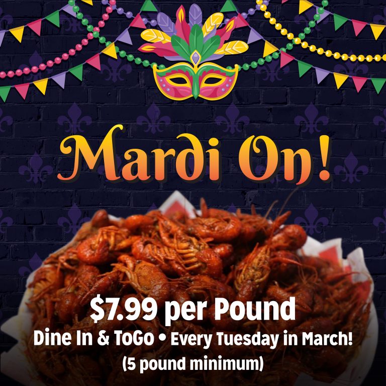 Tuesdays – It’s crawfish season in the Energy Corridor and BB’s Tex-Orleans is Mardi-ing On all March with a $7.99/pound crawfish special every Tuesday!