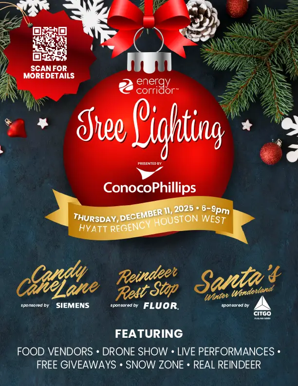 Join us on Thursday, December 11, 2025, from 6-9 pm, for a free community event at the Hyatt Regency Houston West, at 13210 Katy Freeway in Houston, to celebrate the lighting of The Energy Corridor District’s holiday tree!
