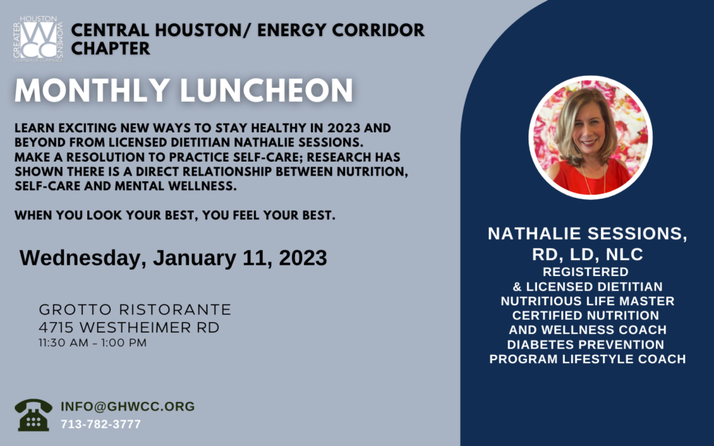 The Greater Houston Women’s Chamber of Commerce Central Houston/Energy Corridor Chapter is hosting a panel of nutrition experts for its monthly luncheon on January 11 at 11:30 AM.
